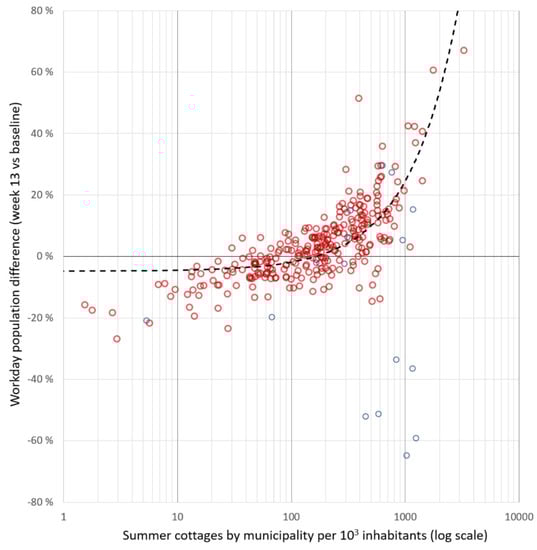 Figure 4 and Figure 5 indicate the movement of people from larger urban settlements to more rural municipalities along the coast and in central Finland. The exception here are the municipalities of the Åland archipelago, where ferry traffic was put on hold and people were unable to move there. The linear correlation between the relative change in the presence of people from the baseline and the relative distribution of summer cottages per 1000 official inhabitants is positive and strong (R = 0.75). That is, the more summer cottages per official inhabitants in a municipality, the more presence of people increased. On average, some 370 additional people for every 1000 summer cottages in a municipality arrived to a municipality by the end of March in Finland.