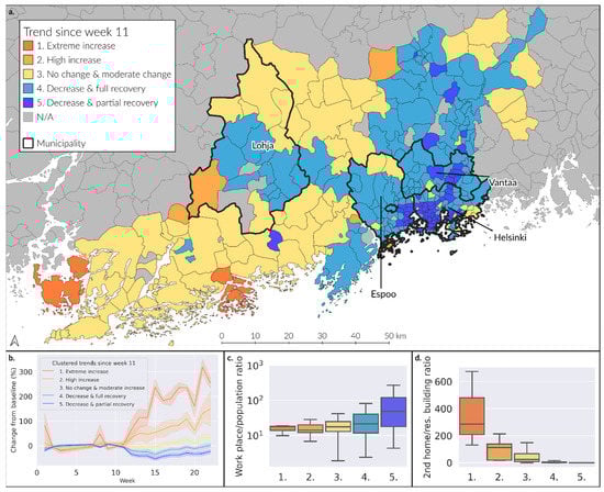 The spatial distribution of postal code areas in the Hospital District of Helsinki and Uusimaa (HUS) region by cluster type (a) based on the temporal dynamics of the presence of people from the baseline (6 January–14 March, 2020) (b). Box plots indicate the distribution of postal code areas by cluster type regarding the ratio of workplaces to population (c) and the ratio of second homes to residential buildings (d).