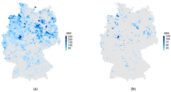 (a) Installed wind turbine capacity and (b) intra-annual capacity increase at LAU2 level in Germany for 2016. In the grey areas no wind turbines are (a) installed or (b) have been added during this year.