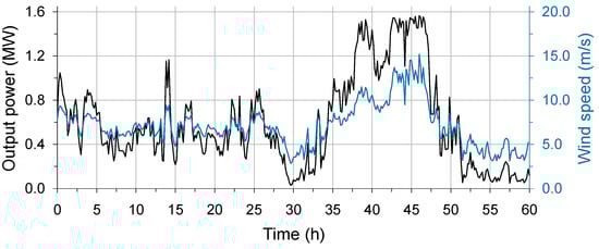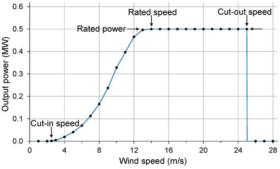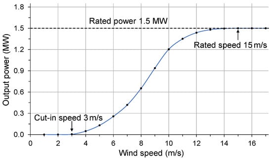 For a reasonable calibration of the wind power model, further information is required, which is not included in the plant dataset shown in Table 1. For the presented simulation model, the data of the specific power curve of a wind turbine, including its characteristic cut-in, rated, and cut-out speed, are necessary. Such power curves, which show the relationship between the wind speed at hub height and the output power at a standardized air density of 1.225 kg/m3, are available in the technical datasheets of the turbine manufacturer or can be found on internet platforms, e.g., at The Wind Power (www.thewindpower.net) [15].