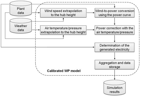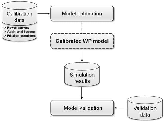 The complete development process from calibration to validation of the wind power model is outlined in Figure 4. In this figure, input and output data are symbolized as containers and the arrows indicate the direction of the data flow.