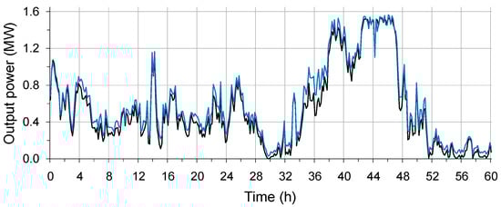 Simulated (black line) and measured (blue line) output power of the wind turbine General Electric GE 1.5sl over a period of 60 h with a temporal resolution of 10 min.