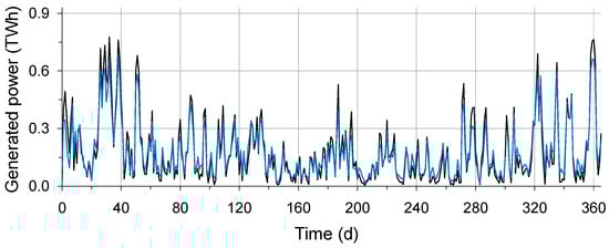 Power production data of variable renewables like wind power are only available for larger regions, such as entire countries. Hence, the electricity generation from all wind turbines of the dataset has to be spatially aggregated to compare it with measured feed-in data for the whole of Germany, provided by the internet platform SMARD of the Federal Network Agency (www.smard.de) [27]. From this platform, measured data of the German wind power production were downloaded for the entire year 2016. It should be mentioned that no measurement data were available by SMARD on three different days during this period and, thus, the resulting zero values are not considered for the validation and faded out in the concerning diagram (Figure 9).