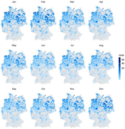 Understanding the variable power generation of existing onshore turbines on a spatiotemporal scale is a precondition for the successful integration of future renewable power plants into increasingly decentralized power systems. Figure 10 shows, as a first utilization example regarding this topic, the monthly electricity production from wind turbines at the spatial resolution of LAU2 based on the performed simulations. Hence, regional advances of the energy transition towards higher shares of wind power can be reliably monitored with the help of such maps.