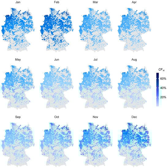 In this expression, T stands for the specified period of time, Cwt is the wind turbine capacity installed in the considered region, and Ewt is the produced electricity from wind turbines in this region and period. Figure 11 shows the monthly capacity factors at the spatial resolution of LAU2 in Germany for the year 2016.