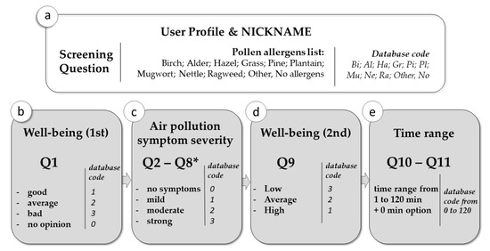 The flowchart of the air pollution symptom mapping (APSM) questionnaire: (a) the user-screening question about pollen allergy as well as an individual nickname and survey four-digit code assigned to the users’ profile, (b) the introducing question about subjective well-being (asked at the very beginning of the survey), (c) the set of seven close-ended questions about individual symptoms (question no 8 was answered, “Seldom,” “Quite often,” “Very often,” or “I do not rub eyes”), (d) closing questions about subjective well-being, and (e) time and geographical location recording.