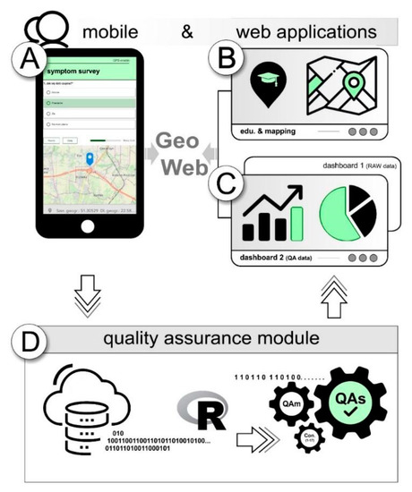 The mobile app (A) includes the APS survey for field data collection. The educational and technical training materials (B) are provided in a narrative web mapping application (Esri story map templates), which are served through Representational State Transfer (REST) services. The collected data are sent to the geodatabase through REST services, and raw data are presented in the dashboard app (C) in real time. Then, the raw data are QA-checked in the database using ArcGIS Desktop integrated with the REST and R statistical software (R: a language and environment for statistical computing; R Foundation for Statistical Computing, Vienna, Austria; www.R-project.org) (D), which is used for analysis of the QA mechanisms and QA system variant robustness, as well as the survey result statistics. Finally, the QA-checked data are returned to the database and presented as APSM results in the open web mapping applications, including dashboards (C). The results were reported in the dashboard app as a percentage of the observations eliminated by the most robust QA mechanism combination, presenting the total robustness of the implemented QA system.