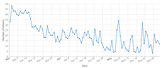 During the data collection campaign, 1936 APS reports were sent by citizens to the cloud, which were used as the input to the QA-mechanism-developed database. The citizen scientists involved in the APSM project became members of the Citizen Science Community of University of Warsaw (CS-Community-UW; Warsaw, Poland) (https://arcg.is/WeqfK), which was set up to share all project data, materials, and apps in GeoWeb, available at https://arcg.is/1iDD18, in order to provide continuous access to the results. When citizens collected data, their activity was controlled and updated every month in a user activity module implemented in the dashboard app (Section 3.3). Analysis of the activity curve indicated that citizen activity peaked for 11 days at the beginning of the campaign (39–48 reports per day) and then decreased. After this, activity stabilized at between 4 and 29 reports per day, with two peaks of 32 and 34 reports per day (Figure 4). The students were more active than non-academic citizens. The most active student collected 25 reports in April, whereas the most active non-academic citizen collected 7 reports in March.