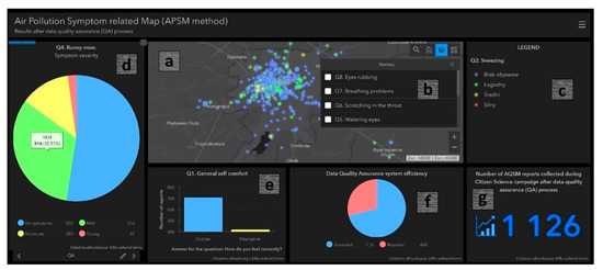 Data quality assurance is key for useful and effective sCS, and so, the results mostly focus on the implemented QA mechanisms and the robustness analysis of the QA system variants for air-pollution-related symptom mapping. We first focused on the field data collection campaign, which provided us with the input for our analysis. The citizen activity curves indicated the varying and regularly decreasing activity of the citizens. For QA robustness results, our key focus was the eight QA system variants, the combinations of five logic-based QA mechanisms, which rejected from 18.3% to 28.6% of reports with data bias. As a result, we created and proposed a QA framework for APSM, based on the ArcGIS platform, which was configured and customized to the study requirements. The air-pollution-related symptom map and GeoWeb apps are presented in Appendix A.