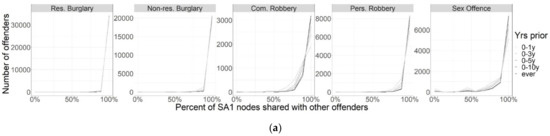 The number of SA1s per offender followed much the same distributions, except in the upper extremes. The median number of SA1s per offender ranged from 13/12 (0–1y) to 29/29 (“ever”) for residential/non-residential burglary, 14/15 to 32/24 for commercial/personal robbery and 5 to 11 for sex offenses. The maximum number of SA1s per offender was 481. As shown in Figure 1, distributions are very similar when comparing the top and bottom graphs, though the tails at the upper end of the distribution are truncated when specific locations are aggregated to SA1 resolution. This suggests a) that for most offenders, their few nodes are distributed among different SA1s and b) for the few offenders with many nodes, many of those nodes are clustered within SA1s.
