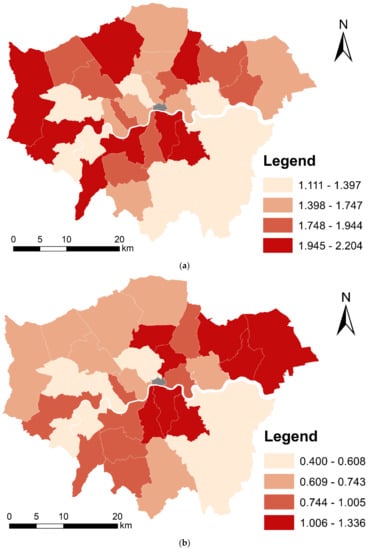 District-level crime rates (cases per 1000 persons) across London in April 2020. (a) Violence-against-the-person rate (values grouped into quantiles); (b)Theft and handling rate (values grouped into quantiles)