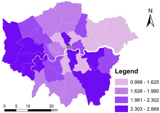 According to routine activity theory, there are several reasons behind the discussions of COVID-19 infection rate and crime rate. First, the incidence of residential crime (e.g., burglary and theft) decreases because people have spent much more time staying at home. Second, as Boman and Gallupe [] explained, public crime is likely to decrease because the young people who are thought be to main offenders lose the opportunity to constitute peer groups after alcohol outlets (bars, pubs, etc) and schools (fights) have been closed due to the large lockdown. Third, owning to increasing police patrols in support of COVID-19 social distancing measures, people are less likely to commit crime on streets (e.g., robbery, commercial burglary, or commercial theft). In London, stricter lockdown measures are likely applied to the districts with a higher COVID-19 infection rate, leading to an increase in stay-at-home time periods and police patrols. The longer the residents stay at home or the more the police patrols there are, the less people are likely to commit a crime (e.g., burglary, robbery, or theft). In addition, since COVID-19 began to outbreak in London since the second half of March in 2020, a lot of people failed to adapt themselves to COVID-19 containment policies (e.g., social distancing measures). Meanwhile, police patrols have not dramatically increased in the most districts of London. Therefore, COVID-19 infection rate and crime rate are found not to be associated in March across London.