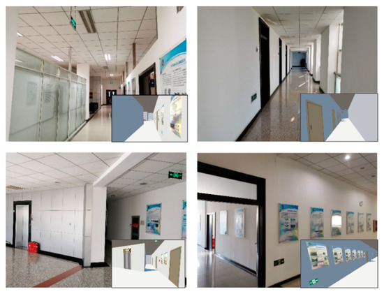 We used an HTC VIVE, an aGlass DKII, and the game engine Unity3D to carry out the VR experiments. The aGlass DKII was connected to the HTC VIVE through a USB cable and fixed in the HTC VIVE. Trajectory data and head direction data were obtained in the unity engine through the HTC VIVE develop API. The eye ray was obtained in the unity engine through the aGlass DKII develop API. In the unity engine, a collider component could be attached to obstacles such as walls. Then, the collision of the eye ray with obstacles, which was referred to as the eye tracking data, could be collected by using the ray cast API of the unity. All data were three-dimensional spatial coordinates. With the HTC VIVE, the position and orientation were tracked by combining an IMU and a lighthouse laser system with a refresh rate 90 Hz [24]. For the aGlass DKII, the sampling error was less than 0.5 degrees, and the delay was less than 5 ms. The tracking speed was 120–380 Hz. Considering the combination of the two devices and the accuracy requirements, we collected the data at a frequency of 90 Hz. We used 3D Max to model an indoor virtual environment consistent with a real environment, including the evacuation guidance system. In this paper, we constructed our VR experimental environment based on an office (Figure 2).