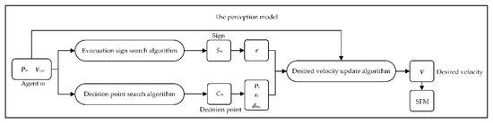 The process for controlling the SFM in the desired direction is very simple. People always move toward a target exit or in a fixed direction. However, in an escape scene, the desired direction of a given human depends on the information indicated by the local environment. To solve this problem, this paper constructed a perception model based on the SFM that enables evacuees to dynamically adjust their desired direction according to the perceived direction information. This model allows agents to act autonomously in complex scenarios. We hypothesized that an evacuee would take the initiative to look for an evacuation sign in the process of escaping and follow the direction of the sign. Evacuees should continue searching for signs and following signs until they find the exit. In this study, we define two basic mathematical concepts regarding the decision point and the evacuation sign. Then, we elaborate on the three algorithms used in the perception model: the evacuation sign search algorithm, decision point search algorithm, and desired velocity update algorithm (Figure 5).