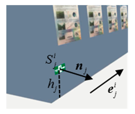 Accordingly, the evacuation sign model is proposed. The indicated direction of the j’th sign for the i’th decision point is called , for which is the location, is the normal direction, is the height, and is the evacuation direction (Figure 7). After the decision point and sign models are built, we can mathematically define the behavior of the agent under the effect of the evacuation sign system.