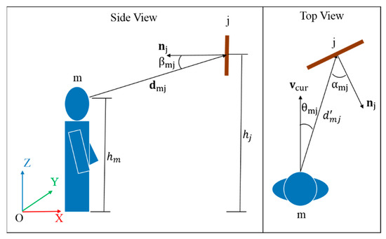 The evacuation sign search algorithm describes the conditions under which an agent can perceive an evacuation sign. Figure 8 shows that agent m perceives an evacuation sign . Since there is no predetermined direction in the SFM, the direction of the current velocity is used as the heading direction. is the vector from the eyes of m to the center of . is the projection of on the XOY plane (Figure 8). Agent m can perceive evacuation sign when the following conditions are met: