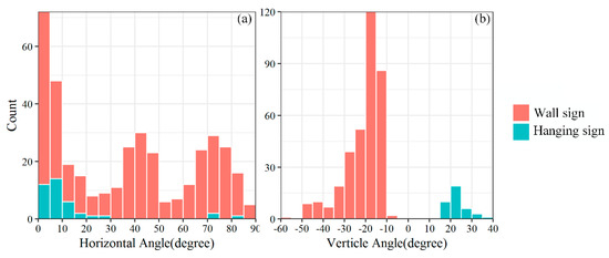 Figure 11 takes 5 degrees as an interval for calculating the horizontal and vertical angles between evacuees and evacuation signs when the signs are perceived. Figure 11a shows a statistical histogram of the horizontal angles. We assumed that the horizontal angle meant no difference no matter the people on the left of the sign (negative angle) or on the right of the sign (positive angle). Thus, the absolute values are shown in Figure 11. In general, the perception frequency decreased with increasing horizontal angle. However, two peaks appeared near 45° and 75°. The data of the two peaks occurred mostly on signs 2, 4, and 5. On the one hand, these signs were near decision points, which means that the participants could observe the sign across the decision point from the other road at certain angles. On the other hand, these signs were on the major evacuation path starting from P1, which means that the observation frequency was high. Thus, these certain angles became two peaks. Note that the wall signs were perceived in a wide angle range, while the hanging signs were perceived at a low angle. This could indicate that wall signs are easier to observe from different angles than hanging signs. Figure 11b shows a statistical histogram of the vertical angles. Because hanging signs are usually higher than eye level, while wall signs are usually lower than eye level, and the vertical angles of the two types of signs were distributed in two completely different regions. We believed that the intervals with too few observations were not statistically significant. Therefore, all intervals with fewer than five perceptions were excluded. According to statistics, the range of the horizontal angle was [0°, 85°], the vertical angle range of the hanging signs was [15°, 30°], and the vertical angle range of the wall signs was [−50°, −10°].