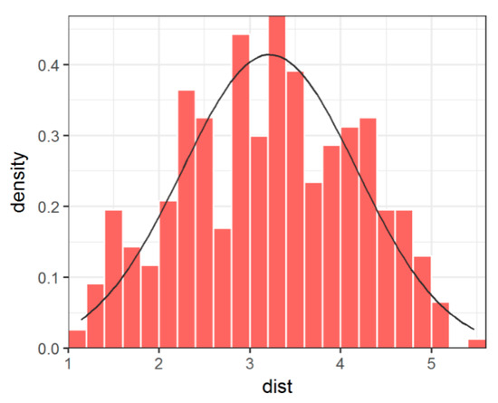 Figure 12 shows the distances at which evacuees observed the signs, and the vertical axis is the probability density of different distances. The data basically conformed to the normal distribution, with a mean of 3.22 m and a variance of 0.93 . Taking the 95% confidence interval, we obtained a maximum perception distance of approximately 5.15 m. We considered that under critical situations, evacuees can perceive evacuation signs when the distances were less than the maximum threshold.