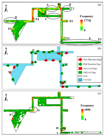 (a) Hotspot chart of escape trajectories, (b) setup of the optimized sign system, and (c) hotspot chart of eye tracking data.