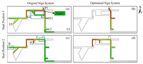 Comparison of trajectory hotspot charts before and after optimization of the model simulation. (a) Simulation result with the original sign system, and participants starting from P1; (b) Simulation result with the optimized sign system, and participants starting from P1; (c) Simulation result with the original sign system, and participants starting from P2; (d) Simulation result with the optimized sign system, and participants starting from P2.