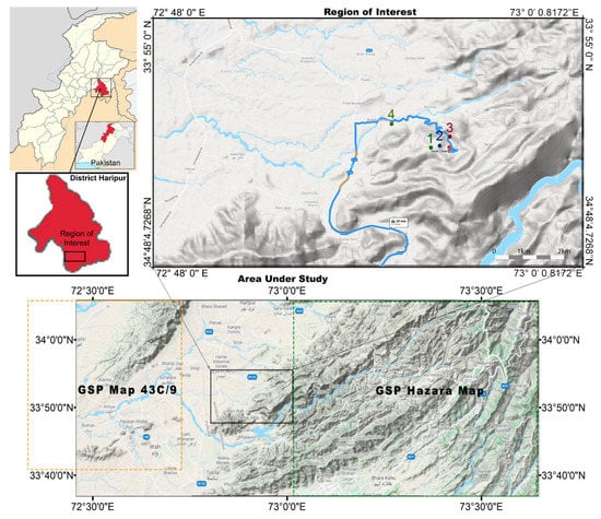 The area under study extends to around 2760 km2 from Tarbela Dam in Khyber Pakhtunkhwa to Lehtrar in the Rawalpindi District of Punjab, Pakistan, as shown in Figure 1. The Hazara map [] is available from 34°21′4.7268″ N, 73°0′0.8172″ E to 33°43′6.8448″ N, 73°30′6.5592″ E on a scale of 1:63,360 or 1 inch to 1 mile. While the GSP map 43C/9 covers the region between 34°0′0″ N, 72°30′0″ E and 33°45′0″ N, 72°45′0″ E on a scale of 1:50,000. However, a geological map was not available for the region of interest between these two maps, as shown in Figure 1. There are three cement quarries in this region, i.e., Dewan Cement Factory, Bestway Hattar, and Bestway Farooqia, and it is a potential site for new cement factories.
