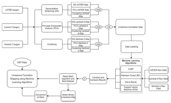 - Unsupervised methods were useful to obtain refined data labels for training and validating the MLAs. In this case, selective color extraction and bitwise arithmetic image fusion were performed using an AND operator on ASTER, Landsat-8, and Sentinel-2 resulting from DS, PCA, and clustering, followed by an OR operator on the resultant DS, PCA, and clustering maps to extract reliable data labels for machine-learning algorithms.