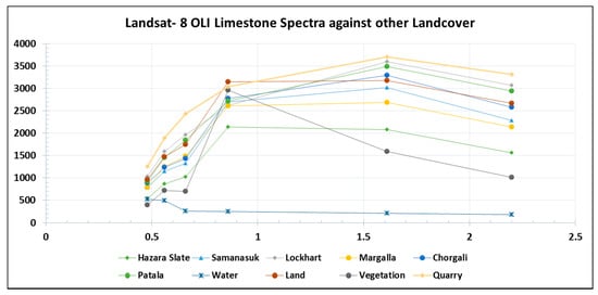 Mean spectral response of features of limestone, water, and vegetation extracted from Landsat-8 for Hattar, Khyber Pakhtunkhwa, Pakistan.