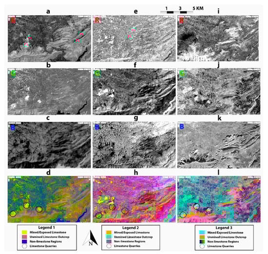 PC images of Landsat-8 (a) PC5 (limestone is shown as bright) (b) PC4 (limestone is shown as bright) (c) PC2 (limestone is shown as dark); ASTER (e) PC6 (limestone is shown as bright) (f) PC4 (limestone is shown as bright) (g) PC2 (limestone is shown as dark); Sentinel-2 (i) PC5 (limestone is shown as bright) (j) PC3 (limestone is shown as bright) (k) PC2 (limestone is shown as dark) and their FCCs (d) Landsat-8 FCC of PCs, (h) ASTER FCC of PCs, and (l) Sentinel-2 FCCs of PCs for the region of interest, i.e., Hattar, Khyber Pakhtunkhwa, Pakistan.