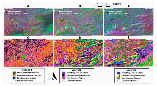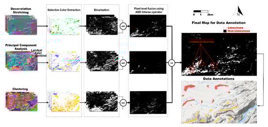 Further, the OR operator’s application allowed for the union of the three binary maps obtained after the AND operator, integrating limestone indications reported by any of these three techniques. These three maps were fused using an OR operation on binary limestone pixels to obtain a final map for data annotation. The resultant image’s noise was filtered out using a 5 × 5 median filter, and limestone annotations were refined using a morphology filter with a 5 × 5 square structuring element. The final image was used to select data annotations for use in supervised classifications representing the most probable limestone indications while applying three unsupervised techniques to three data sources.