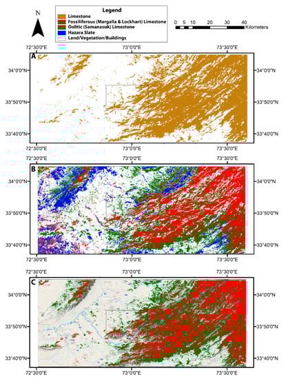 Final classification of “area under study” shown as three subfigures obtained from Landsat-8: (A) Limestone classification results by CART application on Landsat-8 composite, (B) limestone (oolitic and fossiliferous), and Hazara formation classification using random forest application on Landsat-8 composite, (C) limestone (oolitic and fossiliferous) formation map obtained using random forest application on Landsat-8 composite after using limestone binary classification map shown in “A” as a mask (this map is overlaid on terrain map with grey zones indicating slopes within the region).