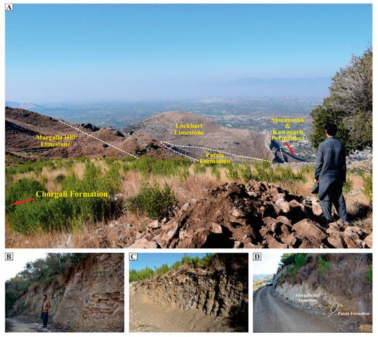Field photographs at locations indicated in Figure 1. (A) Showing different formations exposed in the study area (photo taken at 33.8592 N 72.94397 E and man height = 180 cm for scale). (B) Showing the Hazara Slates, i.e., a non-carbonate sequence (33.86615 N 72.9277 E; man height = 180 cm for scale). (C) Showing the Patala formation (33.863123 N 72.95020 E; hammer length (white circle) = 32 cm for scale). (D) Showing the contact between Patala formation and Margalla Hill limestone (33.860744 N 72.946938 E and hammer length (white circle) = 32 cm for scale).