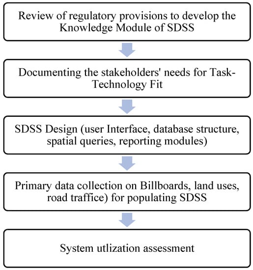 This research is exploratory and applied in nature, adopting a case study approach to gain an indepth understanding of the subject. It follows a five-step process for developing SDSS; starting with reviewing regulatory documents regarding the control and management of billboards to build the knowledge module. All the prohibitive and primitive conditions associated with the outdoor advertisement of billboards were noted down for conversion into equations usable in the knowledge module of the SDSS. After that, the stakeholders’ requirements were documented through focused group discussions with subject matter specialists for task-technology fit framework. The needs so collected were transformed into the design and development of web-based SDSS using open-source tools. The primary data from billboards in the case study area was collected through a mobile-based data collection system to populate the database module. Finally, the SDSS application and utilization assessment for user feedback was conducted. Figure 1 illustrates the methodological framework.