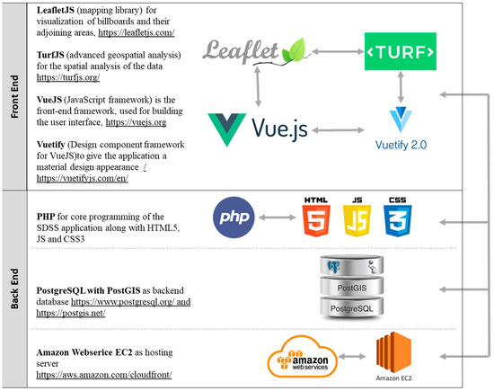 The SDSS is based on open-sourced geospatial technologies. The technology stack being used to develop the portal encompasses a front end, LeafletJS (mapping library) used for visualization of billboards and their adjoining areas. The SDSS uses TurfJS (advanced geospatial analysis) for the spatial analysis of the data; in particular, it is used to filter billboards near roads, inside parcel blocks and in close proximity with other billboards. VueJS (JavaScript framework) is the front-end framework, which is being used for building the user interface, with the plugin Vuetify (the design component framework for VueJS) to give the application a material design appearance. The application is running on a VM instance on amazon cloud. Open street map (OSM) is used for the background base map, whereas Axios (HTTP client) is being used for data acquisition from the source GeoJSON files. The technology stack is illustrated in Figure 4.