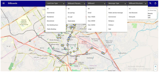 Outdoor advertisements and billboards are a significant contributor to urban visual pollution. In many underdeveloped economies, a complete ban on billboards is not an available management option. The management of billboards in core urban centres is complex as it deals with competing requirements from different interest groups. On the development controlling agencies’ side, billboards are a source of visual pollution, and their locational placement requires considering legal, marketing and ethical considerations. On the other hand, advertisers have a different set of considerations, as they need their advertisements to reach relevant community groups in targeted numbers for revenue generation. This research presents a web-based spatial decision support system to balance the stakeholders’ competing requirements and offers them the ability to compare and contrast various indicators’ compositions to attain the most suitable decision. In addition to the generic selection tools, the system allows for user-specific criteria input for either multilayered query selection or fuzzy AHP. In the case of controlling agencies, they can use the SDSS to identify potential sites to offer for billboard installation.