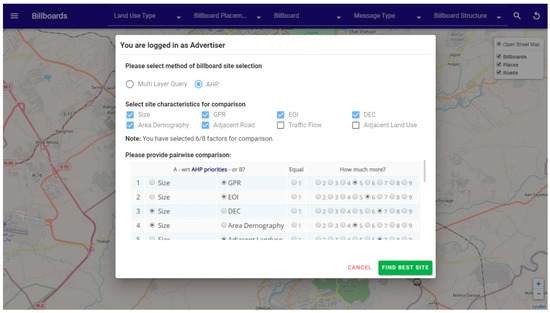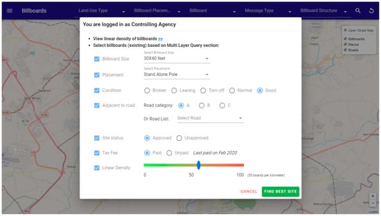 In the case of a controlling agency, a different interface is presented to the user that matches their management functions. In this user case, AHP is particularly useful for exploring new potential sites to open for billboard installation. At the same time, routine management is mainly fulfilled by a multilayered query function. Figure 8 presents the screenshot where the user is allowed to use a graphical user interface to define criteria related to size, placement, condition, adjacency, site status, taxation and linear density.