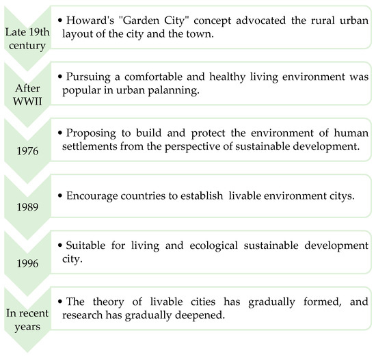 The formation and development of livability theories in Chinese and western cities have taken a long time, and their development process has undergone obvious stages, as shown in Figure 1 and Figure 2. Since Howard proposed the idea of a rural city in the late 19th century, the theory of livable cities in the West has received much attention and research ranging from shallow to deep. From focusing on comfort and health at the beginning to the comprehensive consideration of urban functions such as housing, work, and transportation, the theory of urban livability has gradually improved, and a clear concept was formed in 1996. Later, in North America, Europe, Australia and other countries, researchers applied the livability theory to the assessment and planning of specific livable cities and achieved practical results.