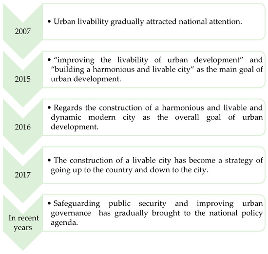 In China, the theory of urban livability began being the subject of wide concern and study relatively late. In 2007, it gradually attracted national attention. In 2016, it was clearly placed in an important position in urban planning and development. Nowadays, the construction of a livable city has become a national top-down development target. The construction of a livable city is more related to the well-being of thousands of people. Therefore, exploring the laws of livable city construction and building a city suitable for human life and residence are the main goals of urban development and the main directions of urban research.