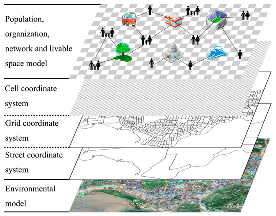 The bottom layer describes the environmental composition of an artificial society, including the coverage of security facilities, fire protection facilities, transportation facilities, emergency facilities, and residential facilities. The middle layer is the artificial social geospatial information model, which mainly establishes the cell coordinate system, the grid coordinate system and the street coordinate system for the geospatial coordinates to determine the spatial position of each agent. The street system is the township-level administrative region of mainland China, and the grid system is that of the Municipal Planning Bureau, which relies on information technology and follows relevant national, industry and local standards to implement the grid division of the entire city in improve the level and efficiency of urban management. The grid, which can promote the in-depth development and information construction of urban grid management, contains numerous cells with a size of 50 × 50 square meters each. The cell includes environmental attributes and the families and residents that live in the area. The top layer is the individual agents and organizational agents in the artificial society and the relationships among the various types of agents, and it includes various elements of livable cities.