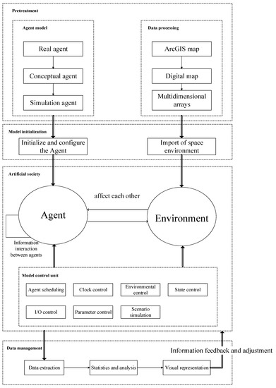 The ULC-AS architecture has four parts: preprocessing, model initialization, artificial society, and data management, as shown in Figure 5. The preprocessing portion contains two parts, the agent model and the initial data processing, thus providing operational agents for the model initialization and multidimensional data information. The model initialization part includes the initial configuration of the agent and the loading of the space environment. The content of the initial configuration of the agent includes the attributes, behavior, type, quantity, order and relationship of the agent. The main function of the space environment loading is to import the processed data into the model as the operating environment of the agent. The artificial society part includes the agent, space environment and model control unit. The agent and space environment are the basic components of the artificial society. The function of the model control unit is to control the normal operation of the system, including agent scheduling, clock control, environmental control, state control, I/O (input/output) control, parameter control and scenario simulation. The data management part can extract data, perform a statistical analysis and provide a visual display of a large number of dynamically changing map data, population data and key parameters. The latest data are used as a variable in the next run of the model and are the basis for information feedback and adjustment in the artificial society. The above four parts form a complete ULC-AS architecture.