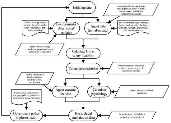 First, the environment and agent data are initialized. The environmental data initialization includes the introduction of the coverage of various safety facilities and the building coverage. When the data are updated, the safety facility coverage calculation, population density calculation and building coverage calculation are performed and visualized. The agent data initialization includes basic information on the government, families, residents, and safety facility management agencies as well as the birth rate, mortality rate, employment rate, unemployment rate, initial satisfaction, and vacant resources. When updating the data, the annual growth, new population, number of deaths, educational status, annual income, and satisfaction calculation must be considered. Then, based on the weights of the safety facilities obtained through the survey and the coverage rates of the various safety facilities, the livability calculation is carried out. Next, the residents’ satisfaction is calculated based on their preferences and surrounding facilities coverage, and then the decision-making behavior and psychological calculations of the residents and family agents are carried out. The agent decision-making behaviors include facility construction, family relocation, residents seeking employment, and psychological factors to consider the impact of nearby residents’ satisfaction. Finally, statistics and government policies are established. The statistics include cell, grid, and street data statistics, printing and preservation. Government policies include birth policies, immigrant population growth rates and investment intensity regulations, and then, the cycle is repeated.