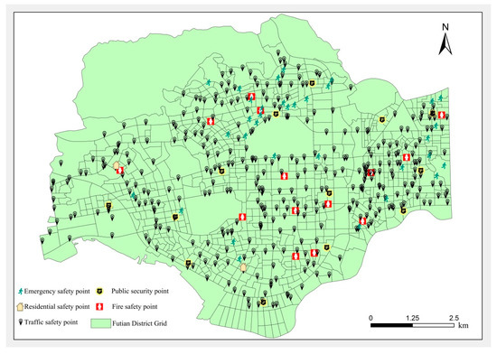 The infrastructure distribution data in the model are provided by the urban construction management department of Futian District, Shenzhen. The distribution map of the infrastructure is shown in Figure 7.