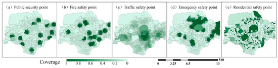 The coverage of each safety indicator is calculated based on the real safety facilities distributed in the geospatial space of Futian District. Centered on the location of a safety facility, the 500-m buffer zone is the scope of the facility, and the real-world security facilities are converted into quantitative coverage data using the geographic information processing software ArcGIS [29]. The safety indicator coverage is calculated in grids. The specific design rules are shown in Formula (1).