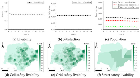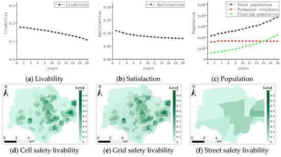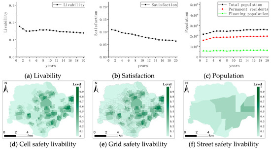 However, the results of the three experiments showed that the safety livability and satisfaction of the cities in the Futian District presented a downward trend within 20 years, and the contrast did not change significantly. The population growth rate of 10–15% provides an example of the results, as shown in Figure 12. The urban safety livability and satisfaction of the Futian District show a downward trend over 20 years, as shown in Figure 12a,b. Figure 12d–f show the distribution maps of urban safety livability at different levels (cell, grid, and street) after 20 years. This finding shows that under the condition in which government investment and construction remain unchanged, the growth of foreign populations makes it difficult to distribute security facility resources to each resident in a balanced manner, resulting in a reduction of per capita security resources and a decline in security facility service capabilities. Therefore, population growth is an important factor affecting the livability of cities, although the impact of growth within the normal range of the population on the safety of cities is not obvious. Under the normal operation of the Futian District, the population will not change sharply; therefore, in reality, this factor has only a minor effect on the urban safety livability of the Futian District.