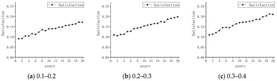 For , the level of resident satisfaction among the surrounding residents affects the satisfaction of the resident, such that it increases or decreases. The specific performance is as follows: the bottom layer will decrease, the middle level will remain unchanged and the high level will decrease. The specific change probability and range of each case is shown in Formula (8).
