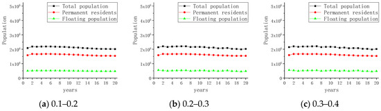 Under the setting of this scenario, experimental results are obtained showing the fluctuation ranges of the growth rate of the foreign population in the ranges of 0–5%, 5–10% and 10–15%. The simulation results show that the population of the Futian District increased to varying degrees over time in the three experiments. Compared with the normal scenario, the total population in the three cases increased by more than 120,000, 190,000 and 360,000 people, as shown in Figure 11.