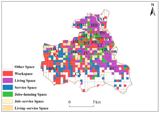 Comparing the proportions of various types of grids in each street, the results show that there are three types of functional districts at the street level in Haikou City—namely, jobs-housing space, workspace, and comprehensive space. Most streets belong to the jobs-housing space, including BL, BS, BH, CX, DT, and 11 other streets; HX2, LS, XX, YF, and CL are workspace; and BA, HX1, XY, and ZS are comprehensive space. No streets belong to the other four types of functional space.