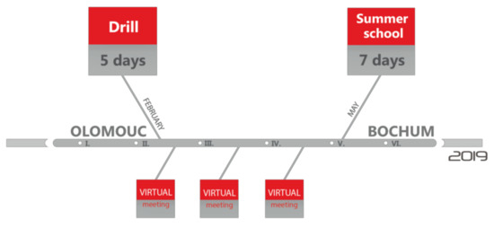 As mentioned earlier, the concept of the simulation game has been developed within the three year Erasmus+ project called “Spationomy” within the program of the Strategic Partnership in the field of education, granted by the European Union. Economic data analysis is a vital part of the decision-making process. The importance of the geospatial component inherent with the most economic data is increasing, and the literature also reflects the fusion of economy and geography (geoinformatics) (e.g., [64,65,66]), which proves the importance of spatial aspects of economic analyses. Even in the modern gaming industry, the spatial component and game spaces play a crucial role since they can evoke narratives that the player engages with [67]. In the project, we intended to go further in the sense of incorporating spatial thinking and skills directly into playful learning. The project’s main goal was to establish a platform for knowledge exchange between teachers and students (undergraduates and graduates) in the fields of geoinformatics, geography, economy, and business informatics. The project aimed to share best practice across disciplinary and national boundaries and to develop deep interdisciplinary cooperation and research sharing among the involved institutions in the field mentioned above. The major teaching/learning part of the project was blended mobility composed of two physical and three virtual meetings (see Figure 1).