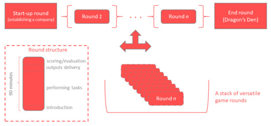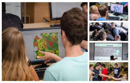 The thematic content of the simulation game rounds was designed in such a way that it kept a balance between geoinformatic and economic focus. That was ensured by sharing responsibilities within the game-masters team during the game preparation, so every project partner designed an independent and versatile simulation game round. All simulation game rounds (except the initial setting-up round) were created in a way that allows them to be played at any stage of the game—the rounds are not dependent on the previous (or next) round, which gave them desired versatility (Figure 2).