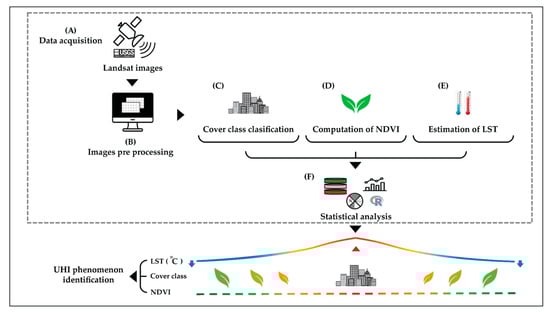 To determine the influence of the change in coverage on the LST, the years 1995 and 2019 were selected. The LST of the vegetation cover class of the year 1995 was used to compare with the LST of all those pixels that changed cover in 2019; the analysis was carried out using the Student’s t-test. Furthermore, to determine if there were statistically significant differences in the mean of the LST between the cover classes, an analysis of the unidirectional variance (ANOVA) by season was performed. The dependent variables were formally tested for normality and homoscedasticity, while the response variables were transformed as needed with 1/x, log10(x), log10(x + 1), and sqrt(x) to meet linearity assumptions. Finally, to establish the relationship between the LST and the NDVI, the values of temperature and the NDVI were extracted for each of the coverage classes. Subsequently, a regression analysis with cross-validation by station was carried out, and the adjustment was compared using the coefficient of determination (R2). All analyses were performed with the glm2 package [64] in the R [65] software. The general schematic workflow for this study is shown in Figure 2.