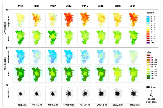 Spatiotemporal variation of land surface temperature and NDVI in dry season (A), wet season (B) and urban zone extension (C).